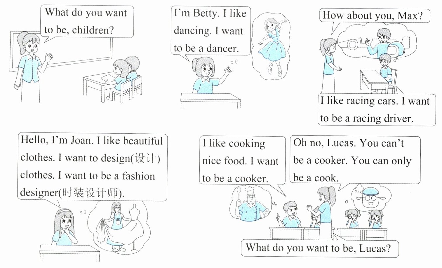 Children talk ____ their dreams(梦想) in my class. Girls have beautiful dreams. Betty wants to be a dancer ____ she ____ ____. Joan wants to be a ____. She'd like to ____ nice ____. What about boys? Max likes ____ ____. So he wants to be a racing ____. Lucas wants to be a cooker. Can his dream come true(实现)? Of course not. Cookers are the tools(工具) we use to ____. Lucas can only be a ____, but not a cooker.