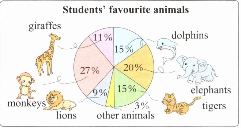 四、新趋势 图表阅读 点点在学校对 100 名同学进行调查,了解了他们最喜欢的动物,并将结果以饼图的形式呈现出来。观察图表,完成句子或对话。