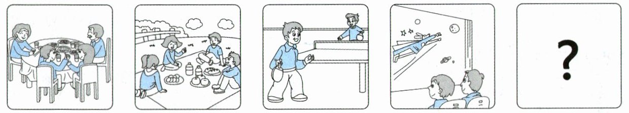 要求:1. 所写内容需包含图中四个方面信息,并发挥想象,适当补充。2. 恰当使用频率副词。3. 条理清晰,语法正确,语句通顺。4. 书写工整、规范。5. 不少于6句话(不包括已给句子)。