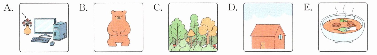 1. C,forest 2. E,soup 3. A,beside 4. D,house 5. B,bear
