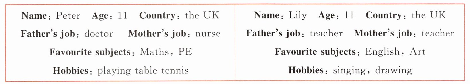 四、亮亮在这次活动中认识了两位新朋友,以下是他们的相关信息。请你选择其中一位,写