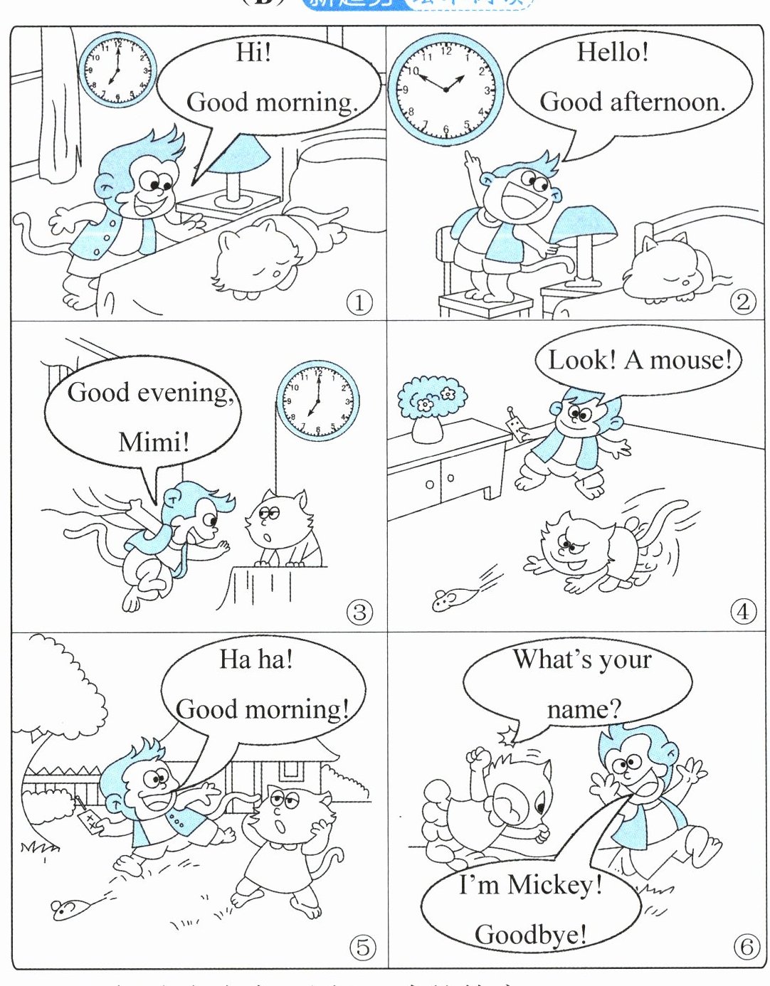 ( )1. 当小猴子说“______”时,Mimi醒了。 A. Hi! Good morning. B. Hello! Good afternoon. C. Good evening, Mimi!