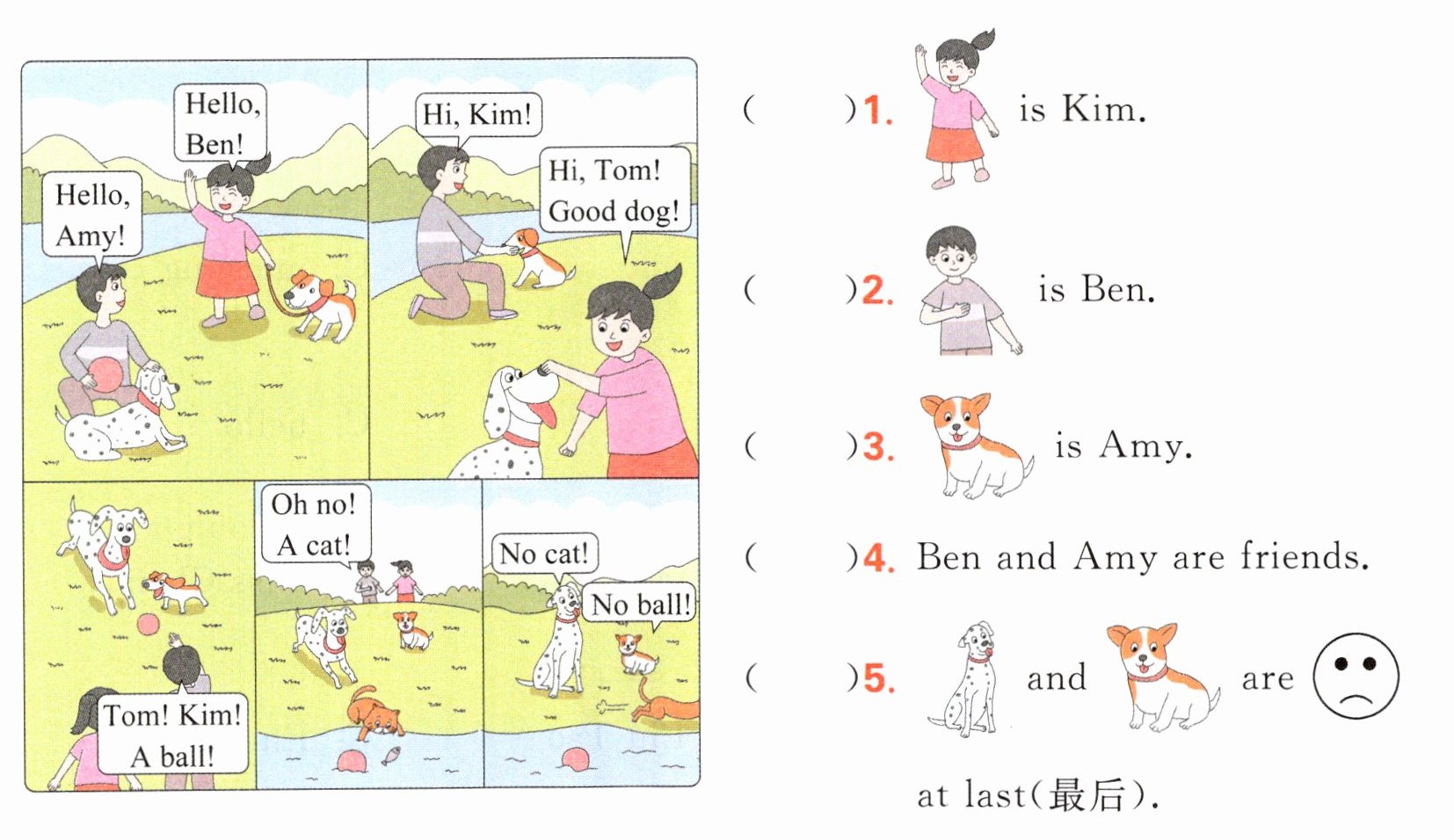 1. × 2. √ 3. ×4. √ 解析 由绘本中男孩和女孩打招呼时互相道出对方的姓名可知,Ben 和 Amy 互相认识,所以他们是朋友,故填√。5. √ 解析 由绘本中球掉进了河里,而猫也跑开了可知,柯基犬 Kim 和斑点狗 Tom 最后并不开心,故填√。