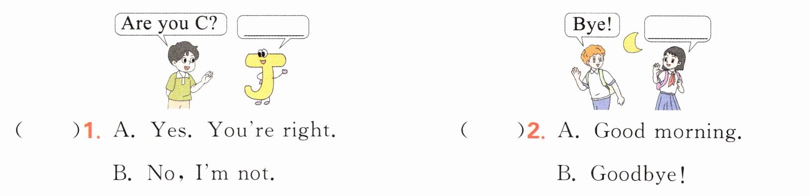 四、看图,选择合适的句子补全对话。