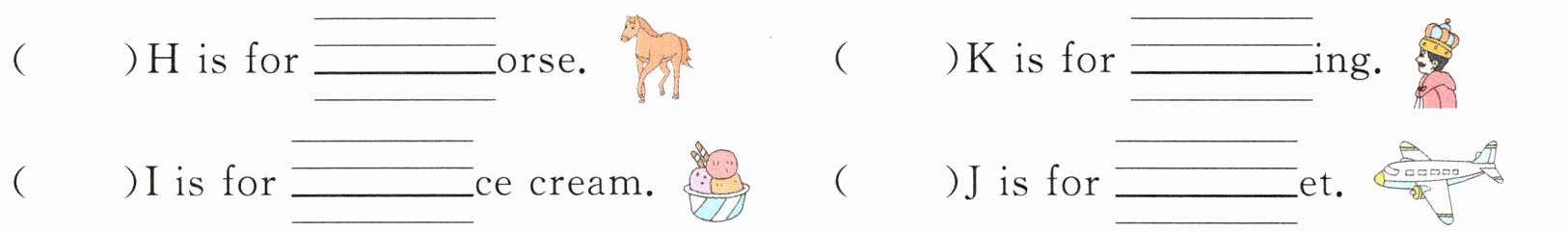 二、根据图片提示写出缺失的字母,并按照字母表顺序为这些句子排序。