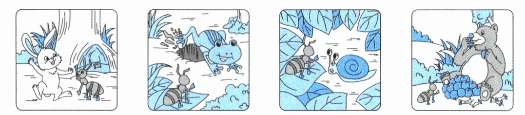 Winter is coming soon(冬天就要来了). The ant wants to play with his friends. But they are very busy(忙碌的). The frog digs a hole(挖洞). The bear eats apples. The snail looks for(寻找) a safe place. They want to sleep in winter. The ant is not happy. Just then, the rabbit walks by. She can play with him. They have fun together.