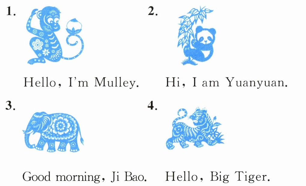 问候语:1. Hello 2. Hi 3. Good morning 4. Hello 名字:1. Mulley 2. Yuanyuan 3. Ji Bao 4. Big Tiger