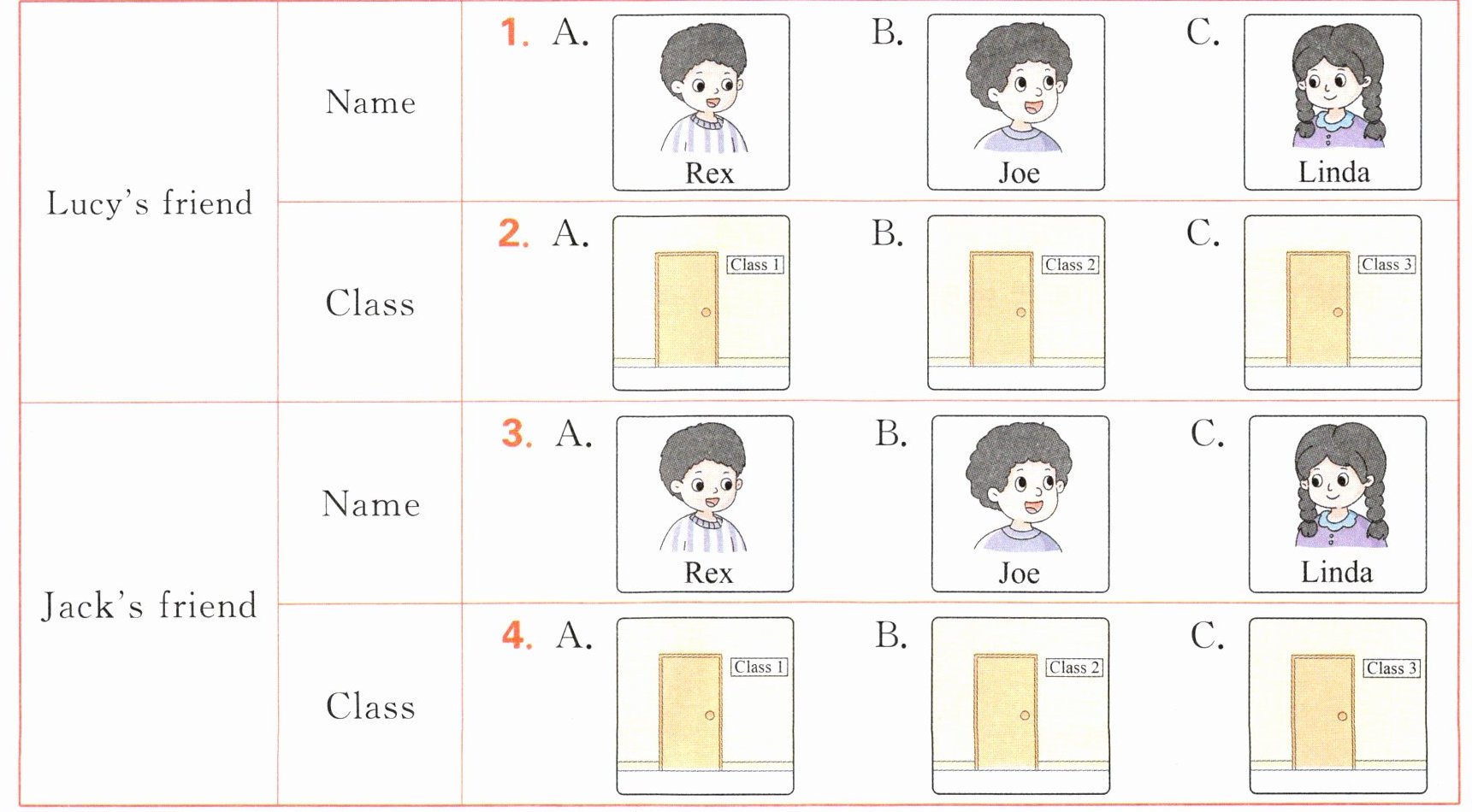1. ______(A. Hello/B. Hi), my name is Liangliang. I am in 2. ______(A. Class 1/B. Class 2), Grade 3. I have many 3. ______(A. friends/B. teachers) at school(在学校). We often play together. This is my 4. ______(A. dad/B. mum). 5. ______(A. He’s/B. She’s) tall. We look alike(相像的). We both love cats.