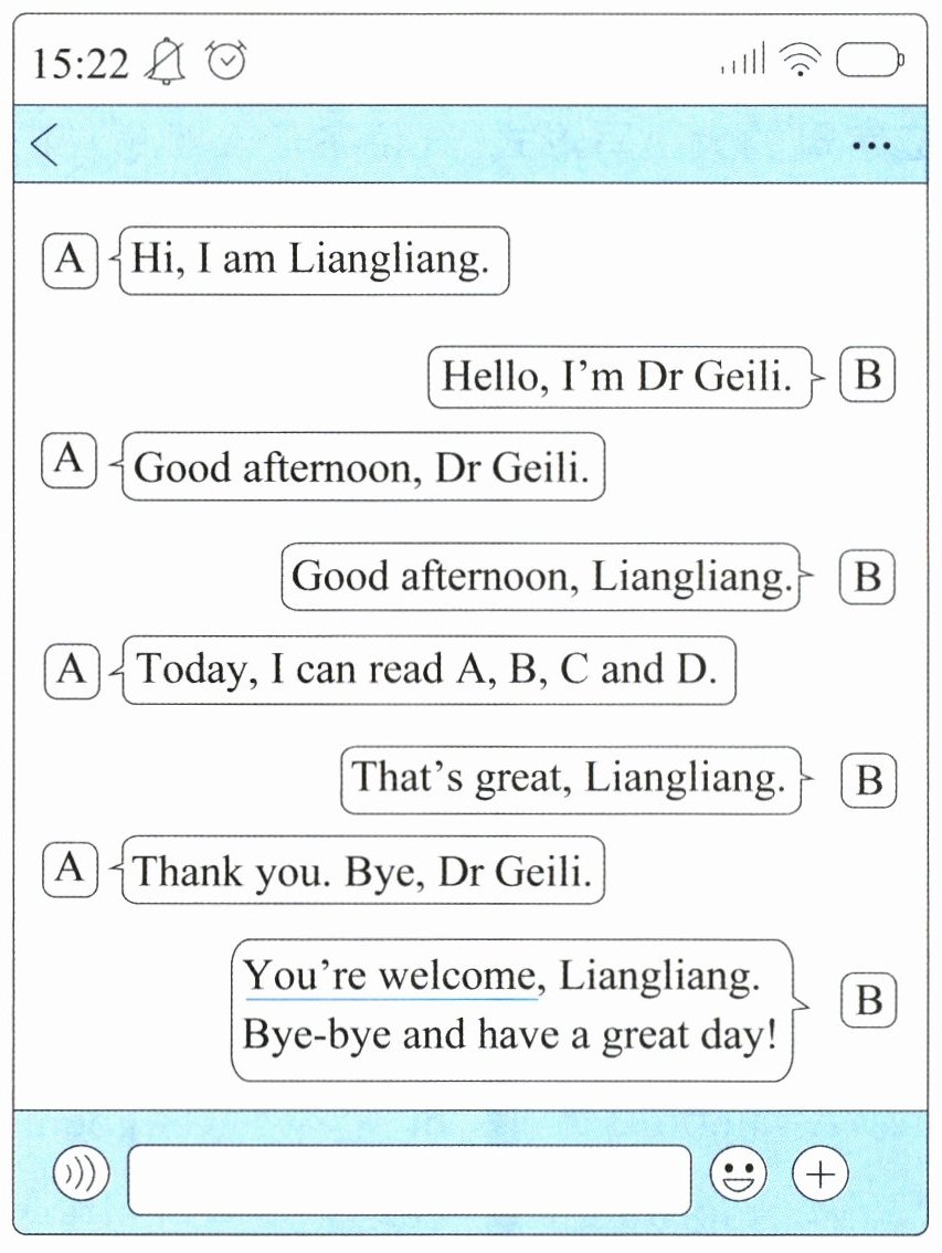 1. × 解析·由聊天截图中A说“Hi,I am Liangliang.”可知,“A”是Liangliang,而不是Dr Geili,故填×。2. √ 3. × 4. √ 解析·“Thank you.”意为“谢谢你”,此时应使用“不用谢”来对他人的感谢表示回应,可推知“You're welcome.”意为“不用谢”,故填√。
