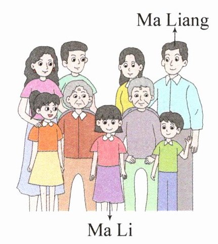 Hello, I'm Ma Li. This is my big and happy family. Look, this is my grandma and this is my grandpa. Look at the boy. He's my brother, Ma Hao. My dad is Ma Liang. My mum is Han Fei. Who's the girl? She's my cousin, Ma Wei. Her dad is my uncle, Ma Ming. Her mum is my aunt, Li Na. I love my family.