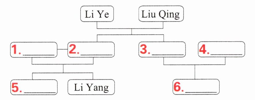 一、新邻居李洋热情地招待了亮亮和楠楠,并向他们介绍起了自己的家庭。请根据李洋的介绍,补全缺少的人名,填序号。