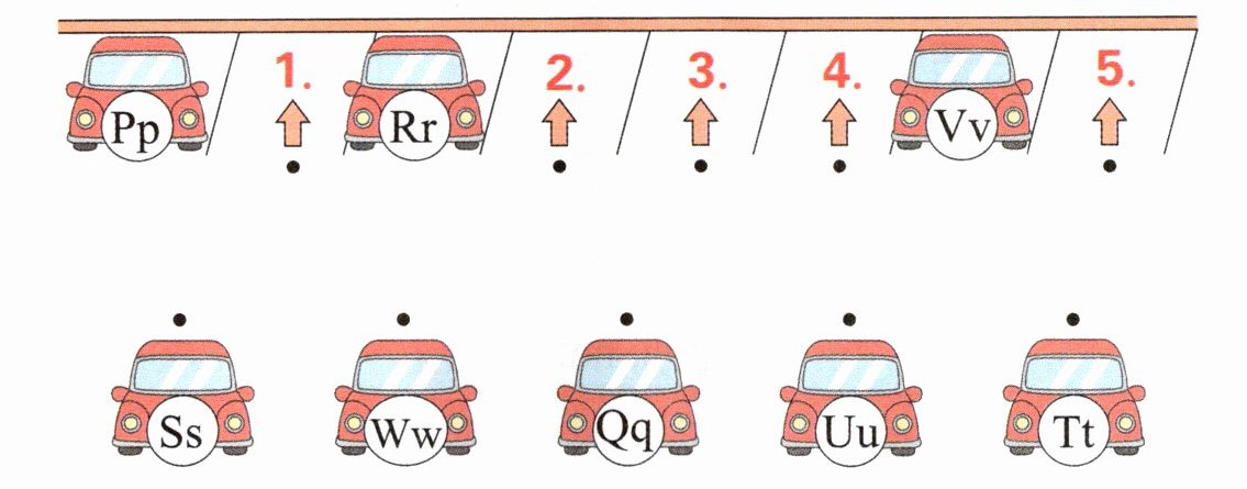 一、停车场进了许多车,为了停放整齐,保安叔叔给每位司机发了一张字母卡。请按字母表顺序,将小汽车与正确的停车位连线。