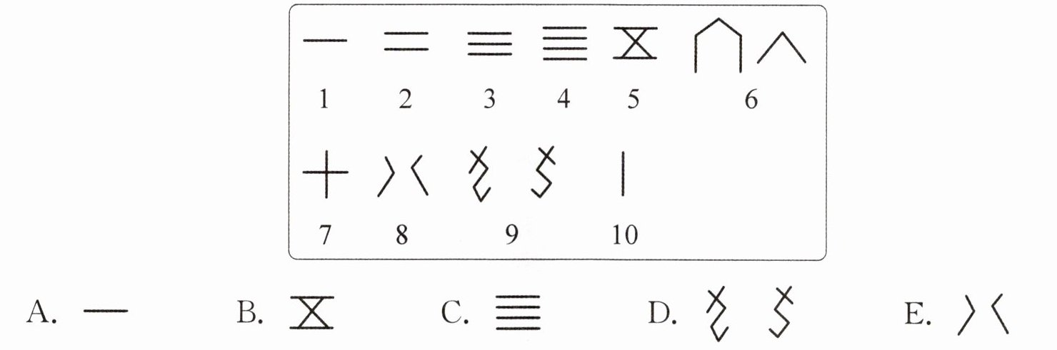 二、新趋势 传统文化 甲骨文是镌刻或写在龟甲和兽骨上的文字,是迄今为止中国发现的年代最早的成熟文字系统,其1—10的数字表示方法如下,请你从方框中给下列算式选择正确的答案,填序号。