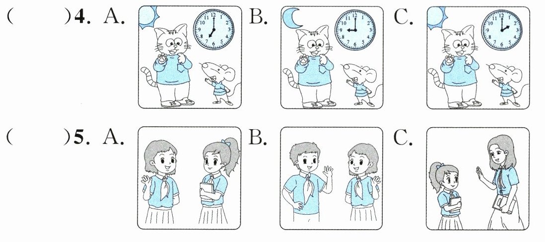 ( )4. A. 早上好,同学们。 B. 早上好,李老师。 C. 再见,同学们。