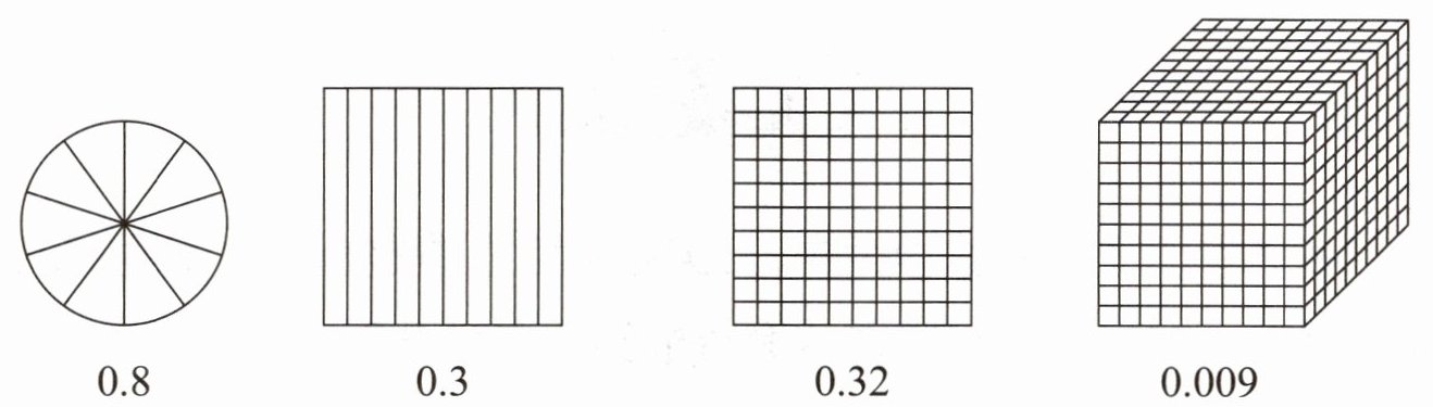 第四个图形:把一个正方体平均分成1000份,每份是0.001,0.009需要涂9个小正方体。