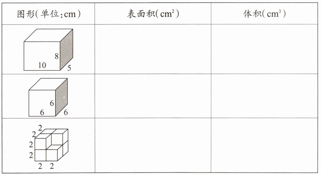 | 图形(单位:cm) | 表面积($cm^2$) | 体积($cm^3$) |
