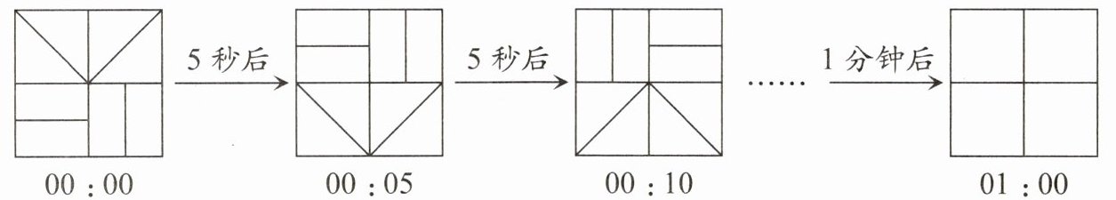 如图,已知4盏霓虹灯安装在大正方形的4个小正方形框里。接通电源5秒后,上下的灯互换图案;又过5秒,左右的灯互换图案;又过5秒,上下的灯互换图案;又过5秒,左右的灯互换图案……请画出经过1分钟后霓虹灯的图案。