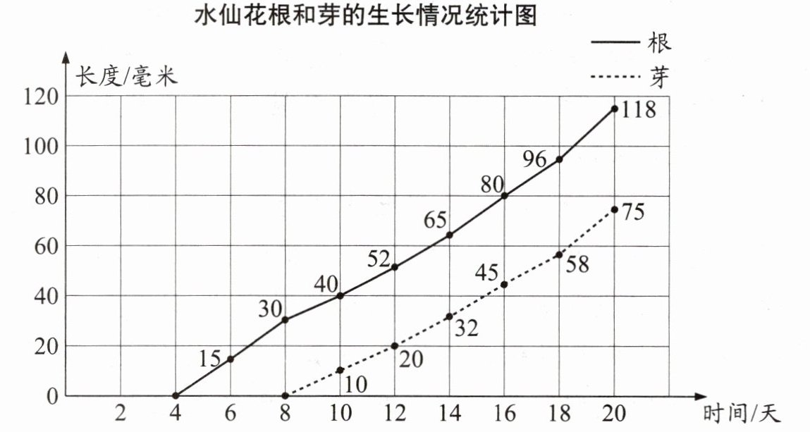 2 小明把一个水仙花球放在装满水的广口玻璃瓶内,每隔一天观察一次,测量根和芽的长度,并将结果制成了下面的统计图。