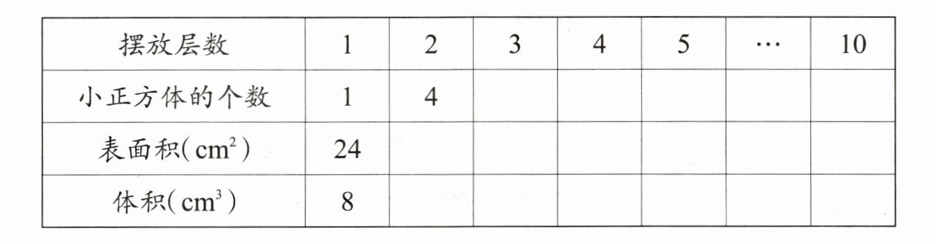 摆放层数为$10$时,体积是$2×2×2×100=800$($cm^3$)。