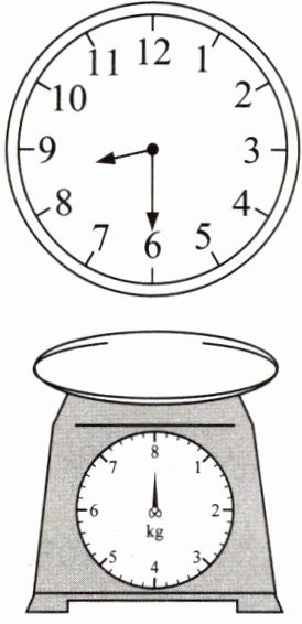 解析:本题主要考查时钟的角度问题以及利用比例关系解决实际问题。对于时钟时针旋转角度的问题,需要知道时钟一圈为$360^{\circ}$,共$12$个大格,每个大格代表的角度是$360÷12 = 30^{\circ}$。从$6:00$到$9:00$,时针走了$9 - 6 = 3$个大格,所以旋转的角度是$3×30^{\circ}= 90^{\circ}$;从$3:00$到$12:00$,时针走了$12 - 3 = 9$个大格,旋转的角度是$9×30^{\circ}= 270^{\circ}$。对于放物品使指针旋转$90^{\circ}$的问题,从图中可知放$2kg$物品时指针旋转了$180^{\circ}$,设放$x kg$物品可以使指针沿顺时针方向旋转$90^{\circ}$,由于指针旋转角度与物品重量成正比例关系,则可列出比例式$2:180 = x:90$,通过解比例可求出$x$的值。