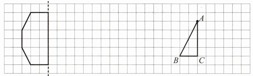 2 画出下面网格中左图的另一半,使它成为轴对称图形;画出下面网格中三角形 ABC 绕点 A 逆时针旋转$90^{\circ }$后的图形。