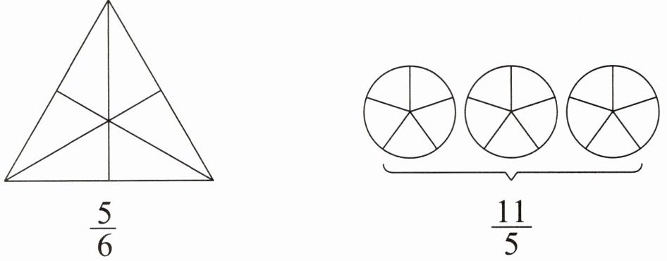 对于第二个图形,它由3个相同的圆组成,每个圆被平均分成了5份,总共$3×5 = 15$份,要表示$\frac{11}{5}$,因为$\frac{11}{5}=2\frac{1}{5}$,这意味着需要涂满2个完整的圆,再在第三个圆中涂1份。