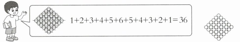 $1+2+3+6×3+5+4+3=36$(个)(答案不唯一)解析:方法一:分割成两个三角形和一个长方形。把图形从中间一分为二,左右两边可看作两个等腰直角三角形,中间部分(画线部分)看作一个长方形。方法二:分割成六个小长方形,把图形从左上到右下平均分成6个小长方形,每个小长方形有6个圆。方法三:分割成一个三角形、一个长方形和一个梯形,把图形最上面的6个圆看作一个等边三角形,右上面的部分看作一个直角梯形,下面的部分看作一个长方形。通过以上三种方法,都可得出图中圆的个数为36。