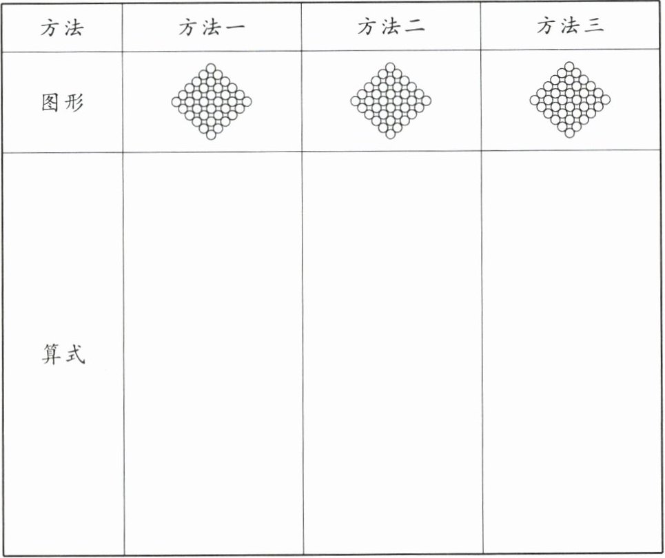 你打算怎么算出图中○的个数呢?试着在下表的图中分一分,像上面这样画一画,表示出你的想法,再列出相应的算式。尝试写出3种不同的方法。(6分)