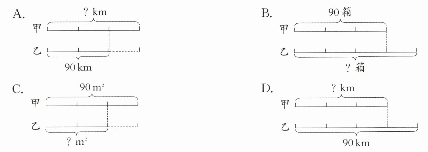 1. 下列线段图表示的问题中,能用算式$90×(1-\frac{1}{3})$解答的是( )。