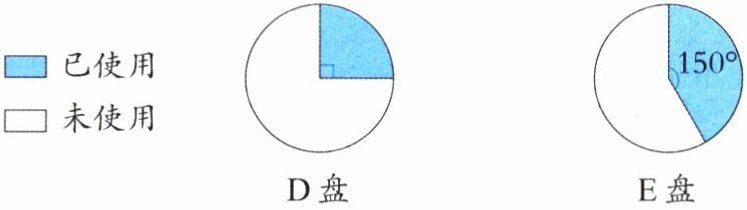 (1)$\frac{1}{4}$ $\frac{5}{12}$ (2)D盘:$144×\left(1-\frac{1}{4}\right)=108$(GB) E盘:$288×\left(1-\frac{5}{12}\right)=168$(GB) $108+168=276$(GB) 硬盘中一共还有276 GB的容量是未使用的。