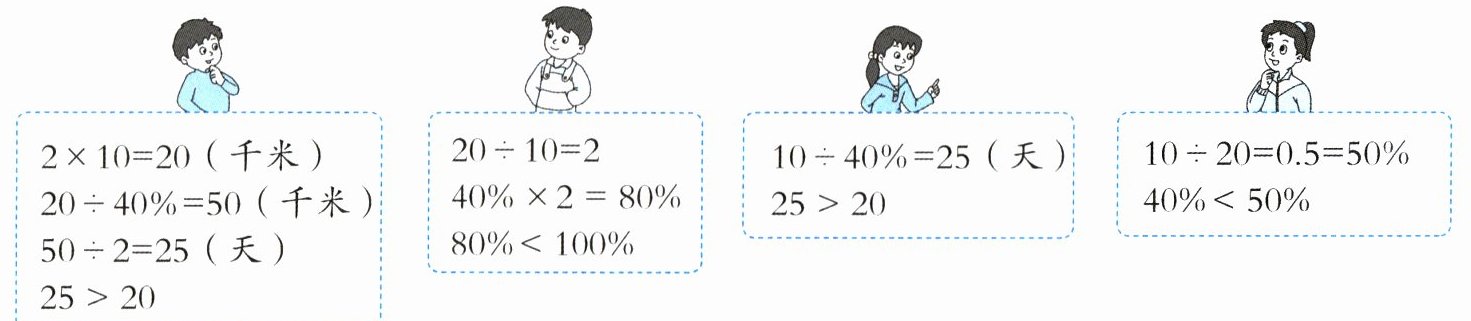 3. 新趋势 算理理解 一个修路队修一条公路,每天修路2千米,10天后修完这条路的$40\%$。照这样的速度,20天能修完吗?四名同学都认为20天不能修完这条公路,计算过程如下,有$( )$人的解题思路正确。