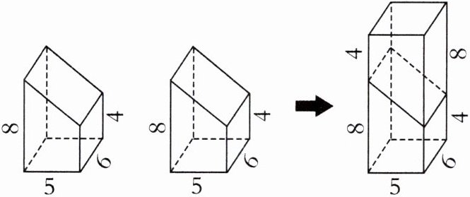 思路分析 这是一个长方体的一部分,可以想象有两个这样的立体图形,拼成一个长方体(如图,单位:cm)。拼成的长方体的长是5cm,宽是6cm,高是4+8= 12(cm)。根据长方体的体积公式,先求出这个长方体的体积,再除以2就是所求立体图形的体积。