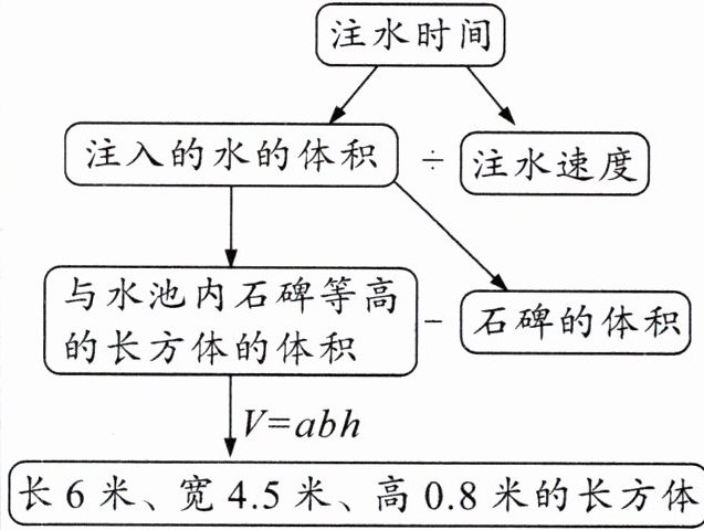 例3 在一个长6米、宽4.5米、深1.6米的水池中,立着一块长2.8米、宽1.5米、高0.8米的石碑。如果以每分钟3.2立方米的流量向水池中注水,那么至少需要多长时间才能将石碑淹没?