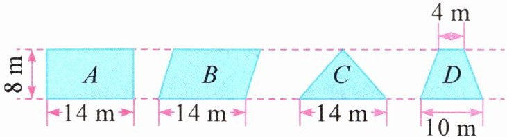 (2) $ 50 × 2 = 100 $(平方米) B 就餐区:$ 14 × 8 = 112 $(平方米) D 就餐区:$ ( 4 + 10 ) × 8 ÷ 2 = 56 $(平方米) $ 56 < 100 < 112 $ 他们选 B 就餐区更合适。