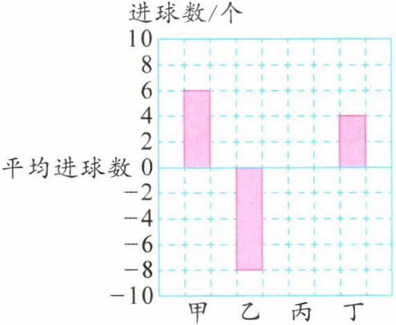 少 2 解析:将甲、丁比平均进球数多的个数补给乙,还剩$6+4-8=2$(个),这 2 个应该补给丙,所以丙的进球数比平均进球数少 2 个。