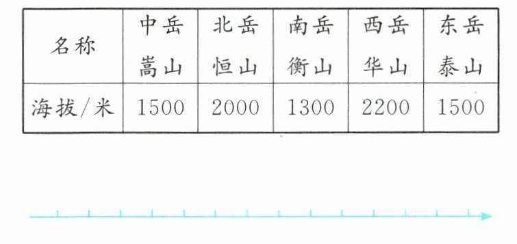 4. “五岳”是中华传统文化中五大名山的总称。下面是“五岳”近似海拔的统计结果。请你以其中一座山的近似海拔为0点,用正、负数在下面的直线上标出“五岳”的近似海拔。(规定向右为正方向)