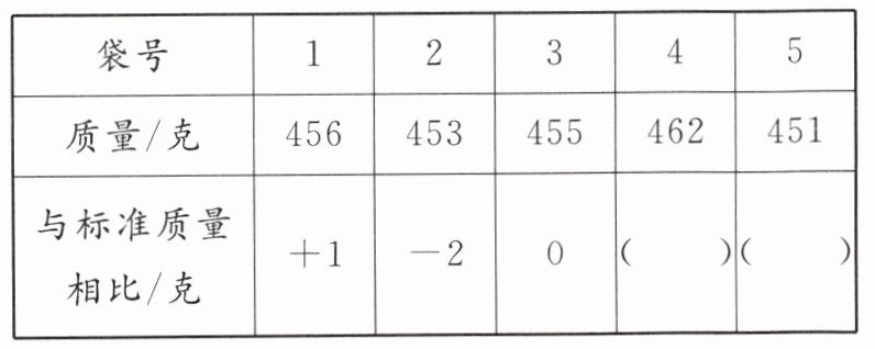 3. (2025·苏州常熟市期末)有一批袋装白糖,标准质量为每袋455克,质量在“455±5克”范围内的都属于合格。从中抽取5袋进行检测,检测结果如下: