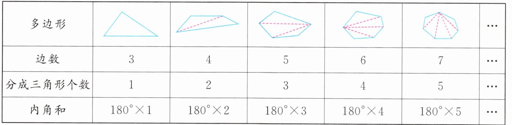 从表中可以发现,转化成的三角形的个数总比多边形的边数少 2,所以求多边形的内角和可以先用边数减 2 求出分割成的三角形的个数,再乘 $ 180 ^ { \circ } $ 就可以了。