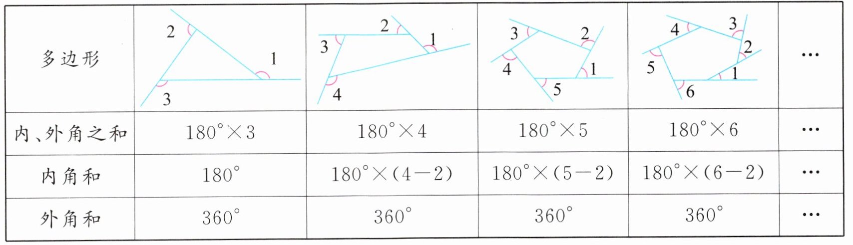 再看四边形,同样地,四边形的每个内角和它对应的外角的和是 $ 180 ^ { \circ } $,四边形共有这样的四组角,内、外角之和是 $ 180 ^ { \circ } × 4 = 720 ^ { \circ } $,四边形的内角和是 $ 360 ^ { \circ } $,所以外角和是 $ 720 ^ { \circ } - 360 ^ { \circ } = 360 ^ { \circ } $,以此推断五边形的外角和是 $ 180 ^ { \circ } × 5 - 540 ^ { \circ } = 360 ^ ……{ \circ } $ 我们可以列个表,方便观察和分析。