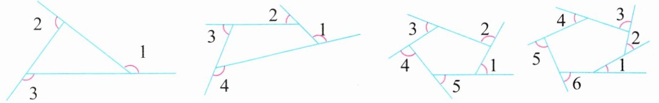 我的思考 先看三角形,三角形的每个内角和它对应的外角的和是 $ 180 ^ { \circ } $,三角形共有这样的三组角,内、外角之和是 $ 180 ^ { \circ } × 3 = 540 ^ { \circ } $,三角形的内角和是 $ 180 ^ { \circ } $,所以外角和是 $ 540 ^ { \circ } - 180 ^ { \circ } = 360 ^ { \circ } $。