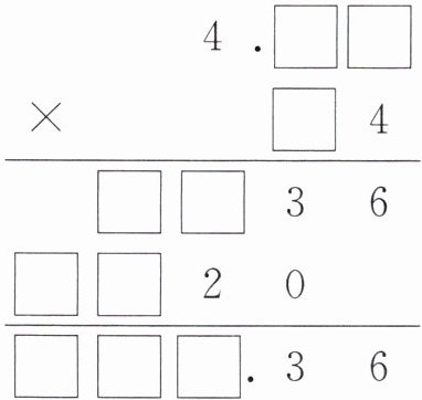 解析:从积的末尾是6可以判断第一个乘数百分位上的数字是4或9,再由这个数字和第二个乘数十位上的数字相乘的积是整十数,可确定第一个乘数百分位上的数字是4,第二个乘数十位上的数字是5;由4□4×4 = □□36可以判断4□4的方框里的数字是3或8,再由4□4×5 = □□20,可确定4□4的方框里的数字是8。所以这两个乘数分别是4.84和54,据此将竖式补充完整。