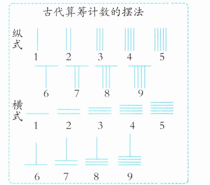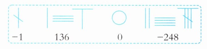 由于记录时换色不方便,后来数学家创造了在数字上画斜杠的方法来表示负数。用○表示 0,5 及 5 以下是几条线即表示几,百位用纵式表示,十位用横式表示,个位用纵式表示。