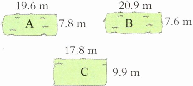 3. 如图,童乐家有3块草地。估一估,( )草地和( )草地的面积大约是160平方米。算一算,( )草地的面积大约是158.8平方米。(填字母)