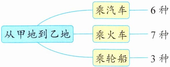 例1 从甲地到乙地,可以乘汽车,也可以乘火车,还可以乘轮船。一天中,汽车有6班,火车有7班,轮船有3班,那么一天中从甲地到乙地共有多少种不同的去法?