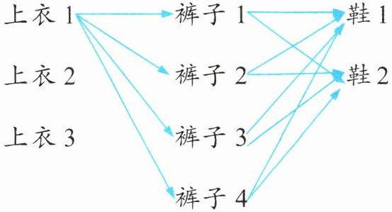 选择上衣1,裤子有4条,就有4种搭配方法,再搭配上鞋1或鞋2,就有 $ (4 × 2) $ 种搭配方法,上衣一共有3件,那么一共有 $ 3 × 4 × 2 = 24 $ (种)搭配方法。