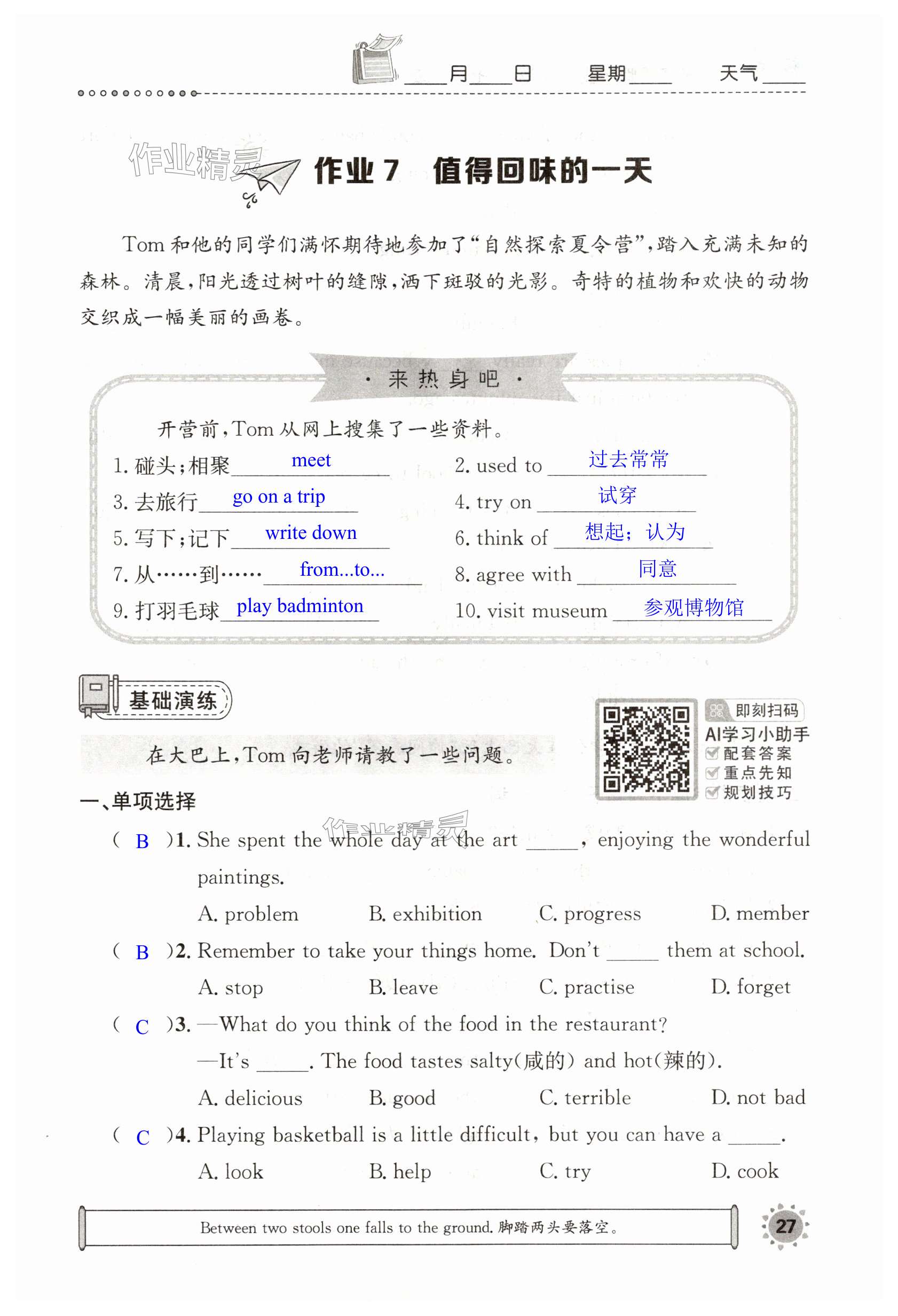 注:目前有些书本章节名称可能整理的还不是很完善,但都是按照顺序排列的,请同学们按照顺序仔细查找。练习册 2025年长江暑假作业七年级英语崇文书局 答案主要是用来给同学们做完题方便对答案用的,请勿直接抄袭。
