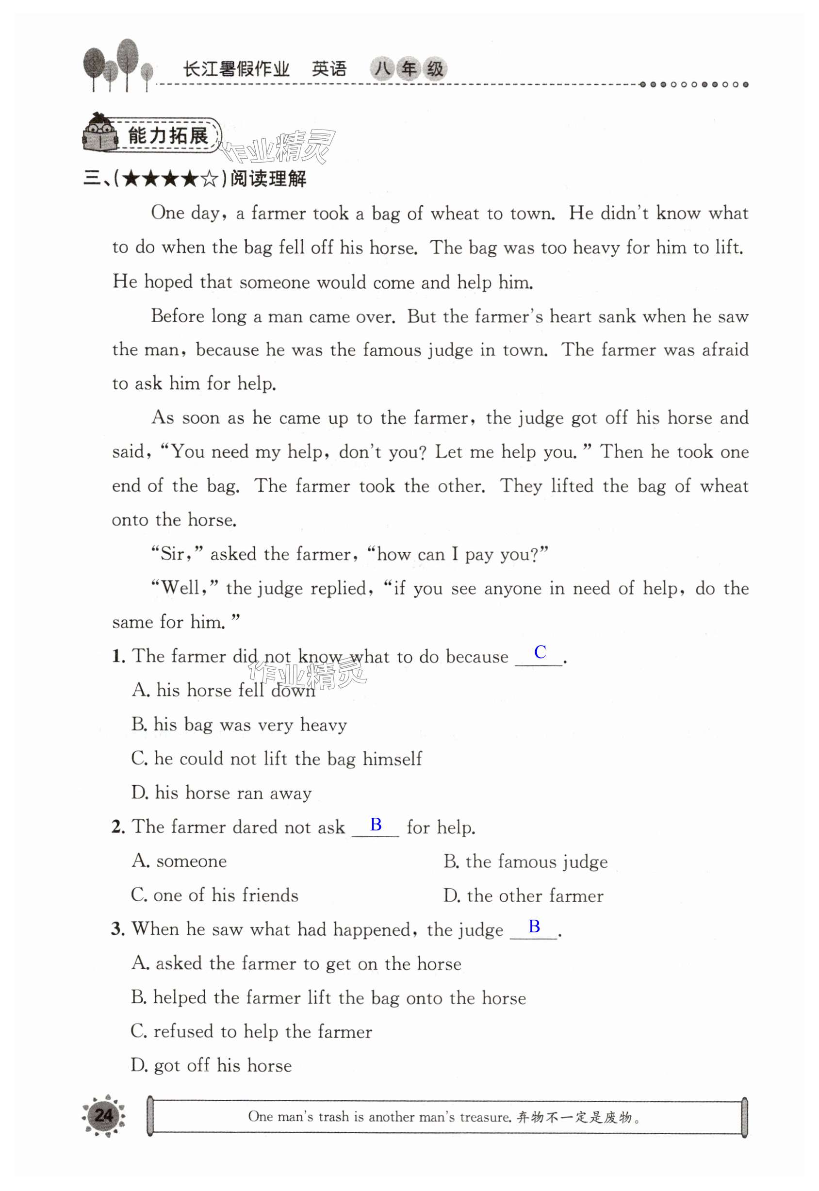 注:目前有些书本章节名称可能整理的还不是很完善,但都是按照顺序排列的,请同学们按照顺序仔细查找。练习册 2025年长江暑假作业崇文书局八年级英语 答案主要是用来给同学们做完题方便对答案用的,请勿直接抄袭。