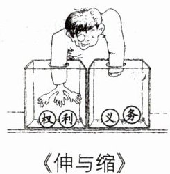 【解析】:漫画《伸与缩》中人物对“权利”伸出双手极力争取,对“义务”却缩手逃避,这讽刺了只想享受权利而不愿履行义务的错误行为。