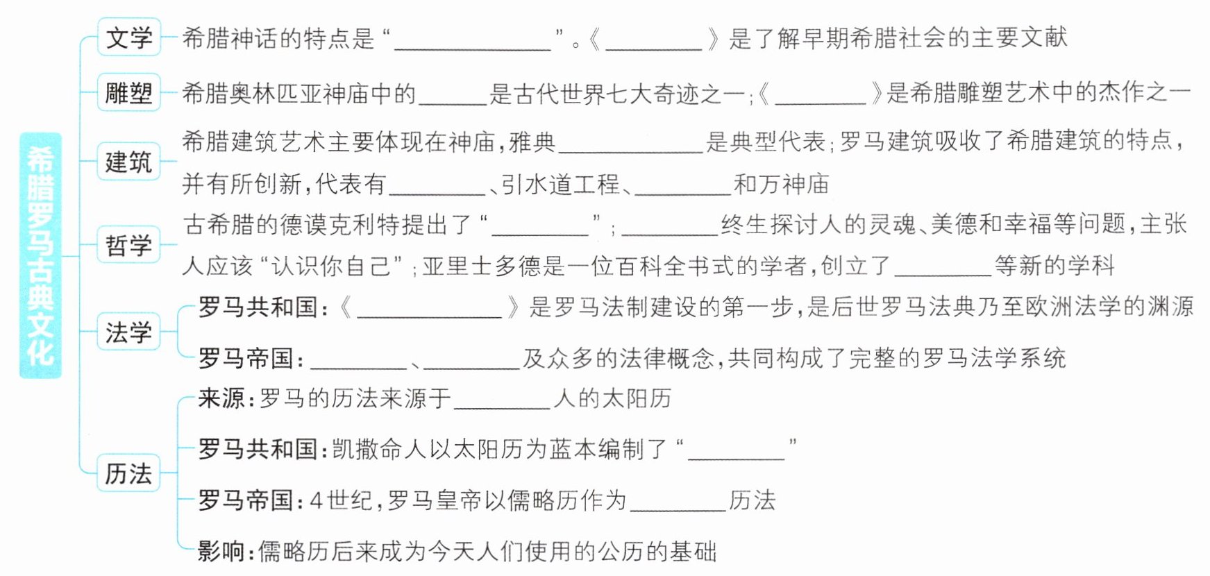 【解析】:本题考查希腊罗马古典文化的相关知识点,包括文学、雕塑、建筑、哲学、法学和历法等方面的内容。需要准确记忆各个知识点的关键信息,如神话特点、代表作品、代表建筑、哲学家的观点、法学成就以及历法的来源和演变等。