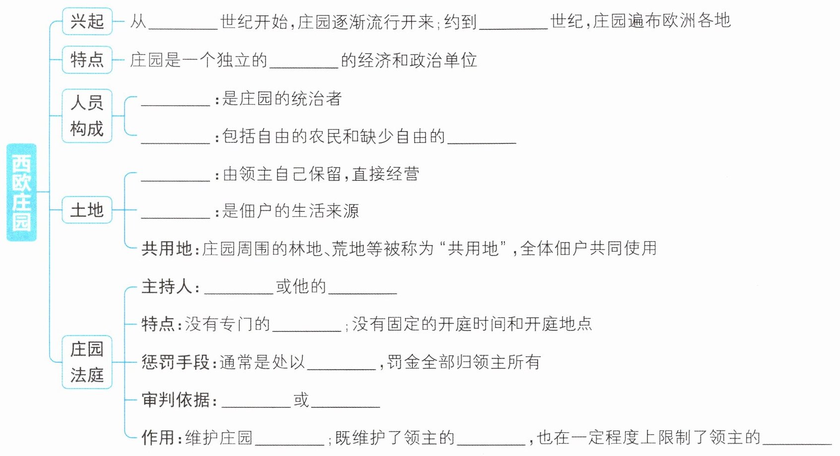 本题主要考查西欧庄园的相关知识,包括兴起时间、特点、人员构成、土地情况以及庄园法庭的相关内容,需要对教材中关于西欧庄园的知识点进行准确记忆和梳理。